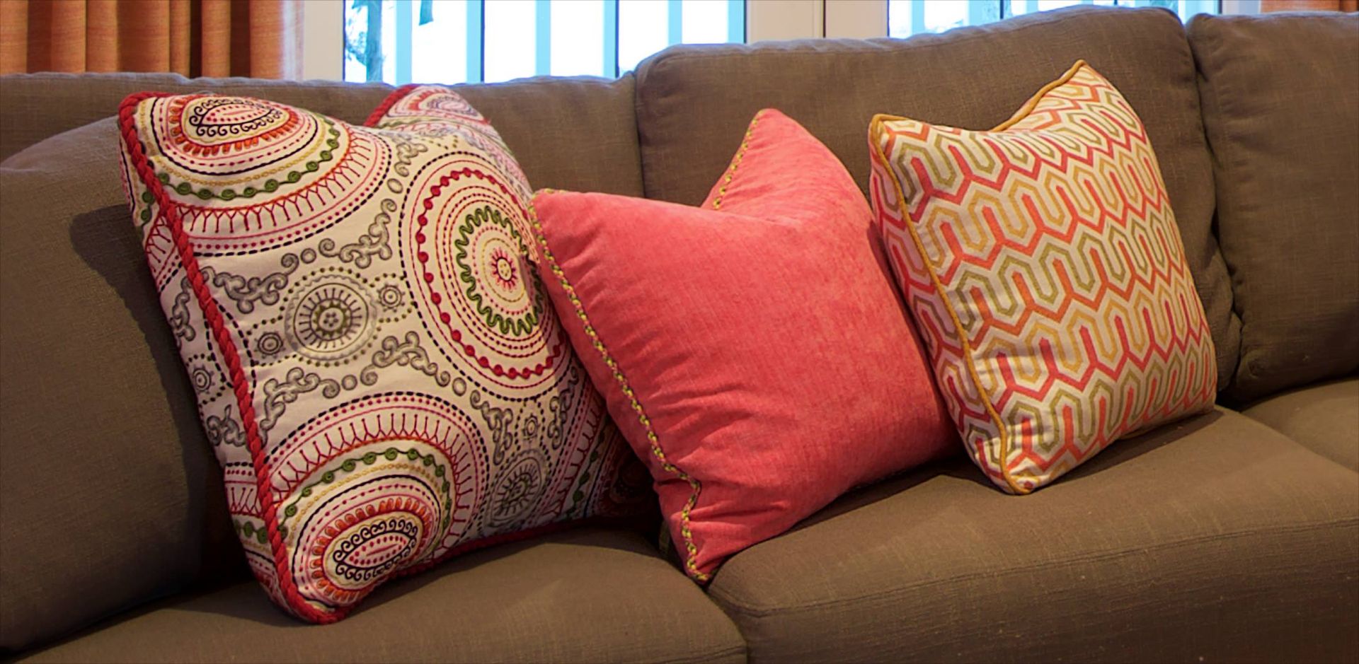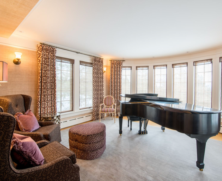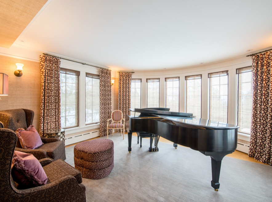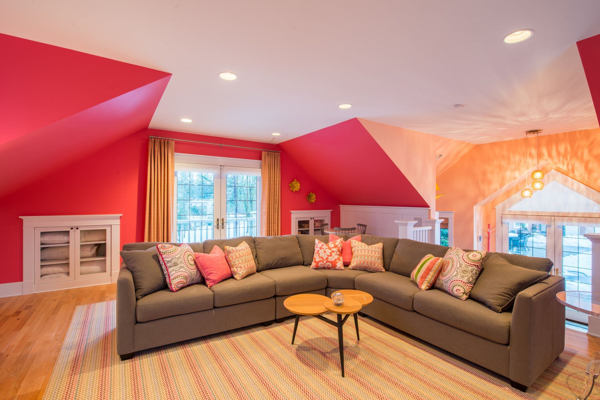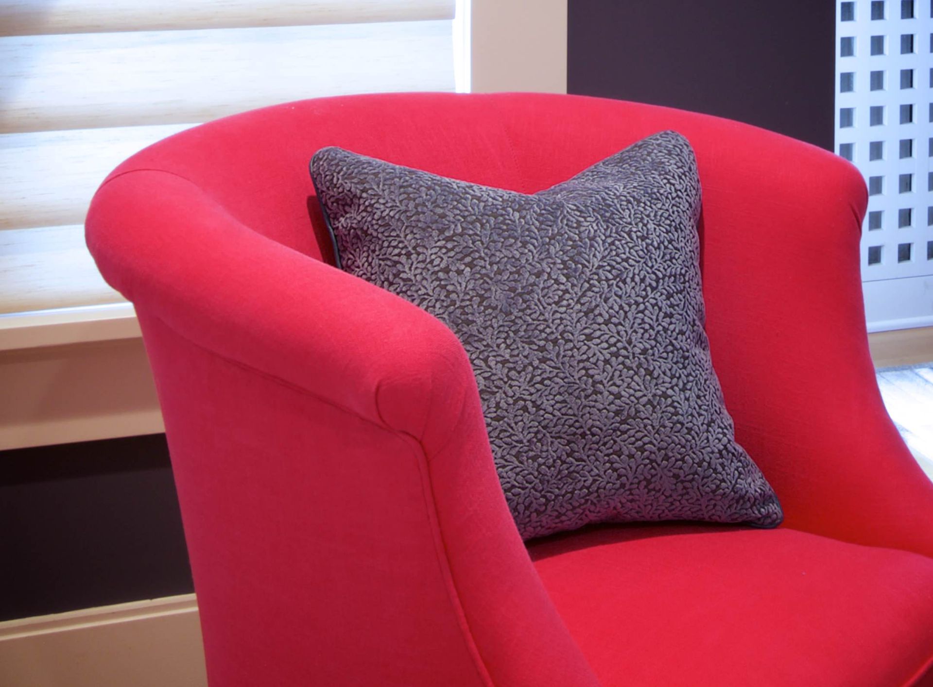Custom pIllows, cushions, ottoman and draperies by Fabric Works. Room Design by Cinda Scadden (Portland Oregon).