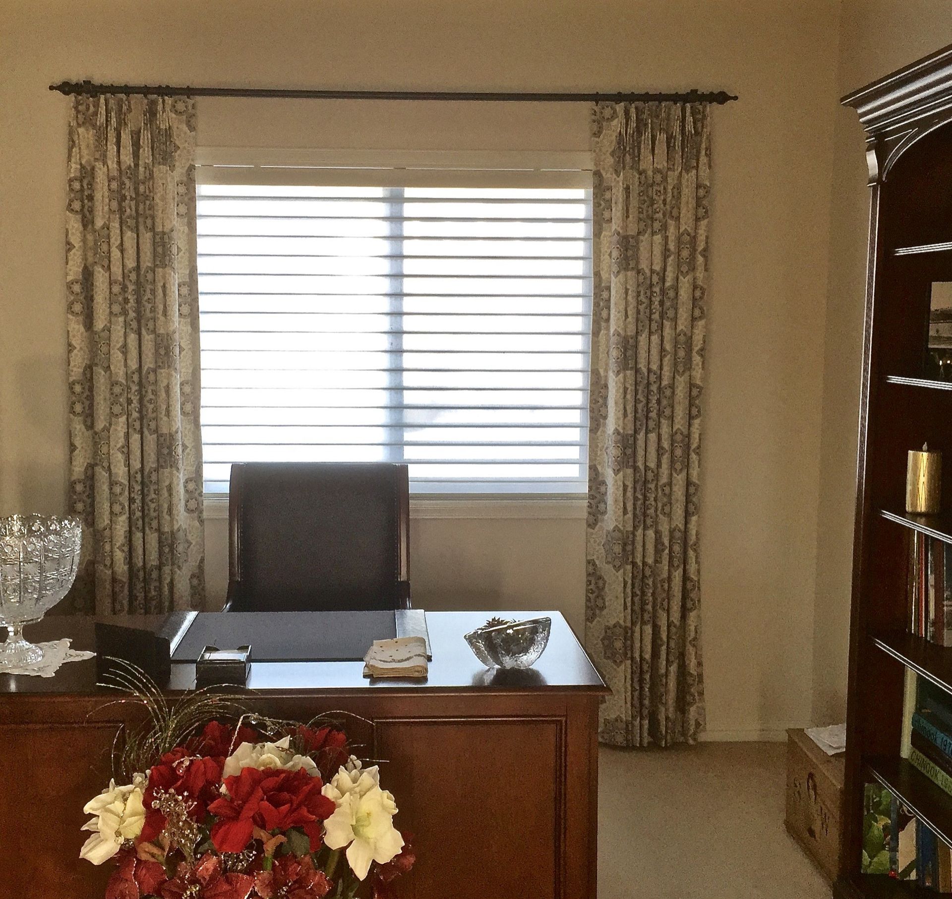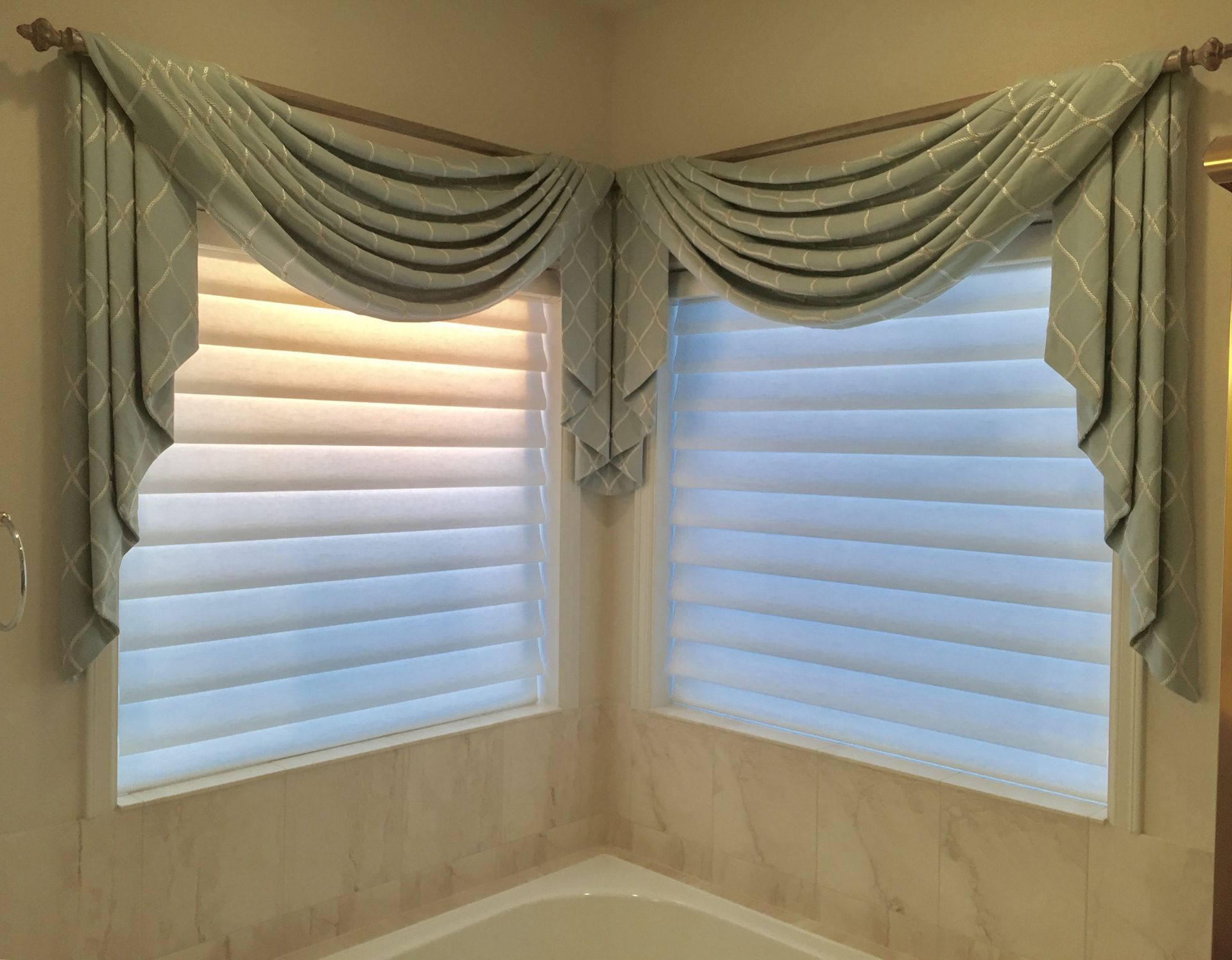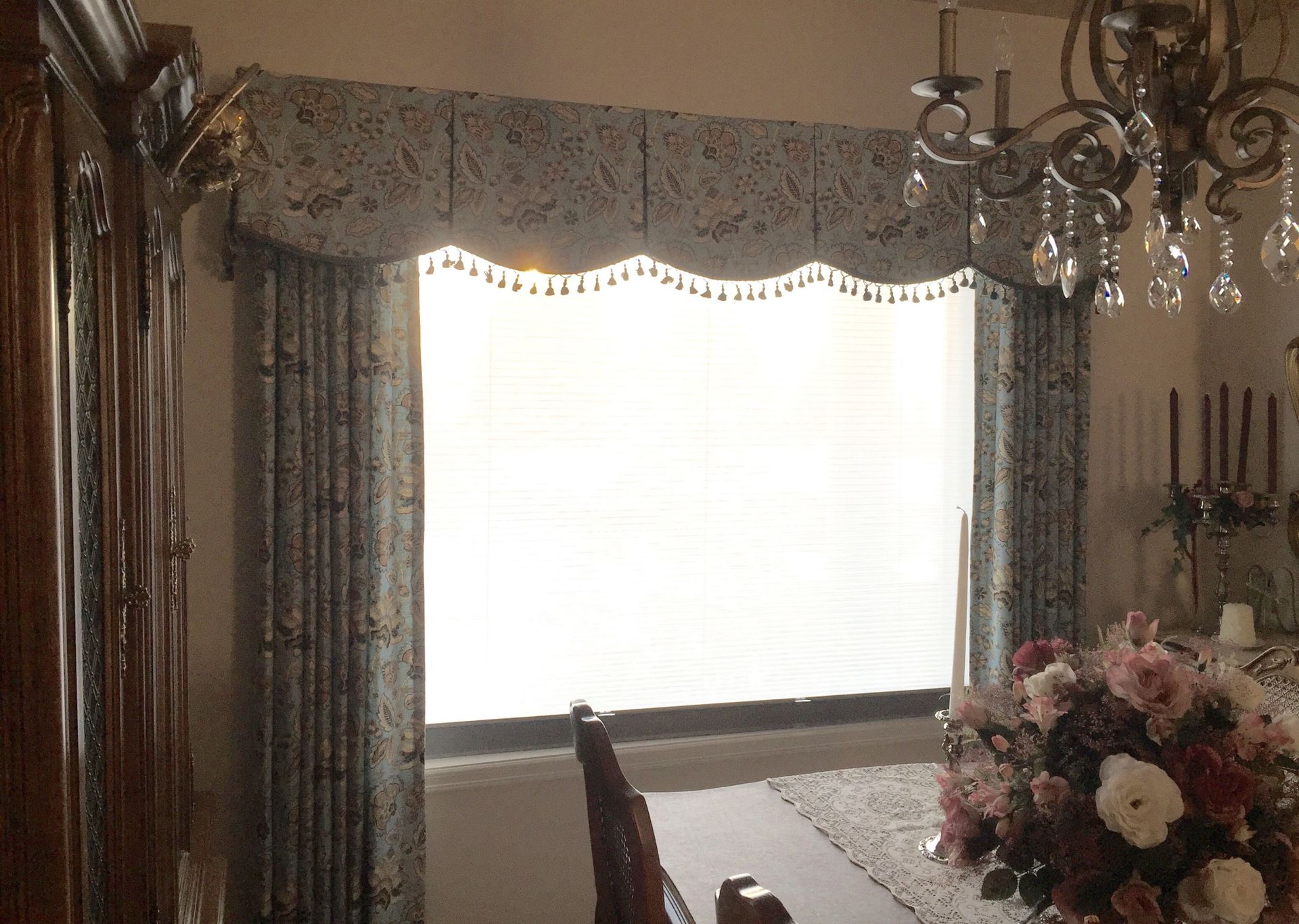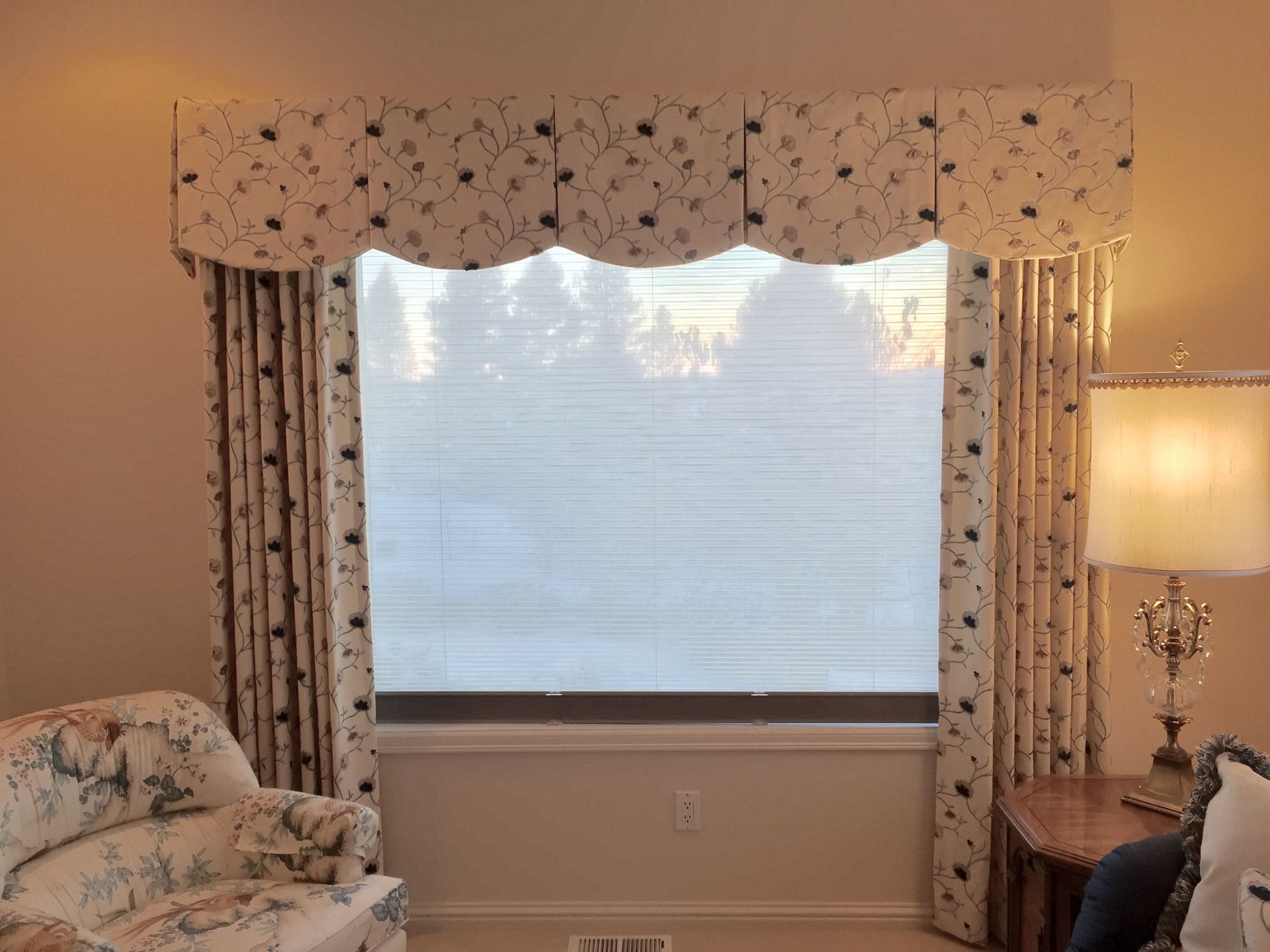 Traditional Home filled with fun fabrics. This home has a beautiful variety of valance styles and coordinating draperies. These window coverings really completed the rooms when pair with a variety of Hunter Douglas products.